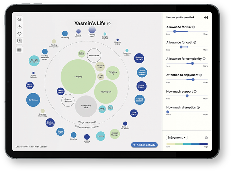 Designed in collaboration with UTS School of Design and Parallel Lines, A Good Life is focused on the question, “Are we supporting you to have a good life?”. By visually representing different aspects and activities in someone’s life, the tool provides a clear understanding of a person’s lived experience. It enables users to better understand the balance between cost, complexity, risk and quality of life in support and care contexts.
